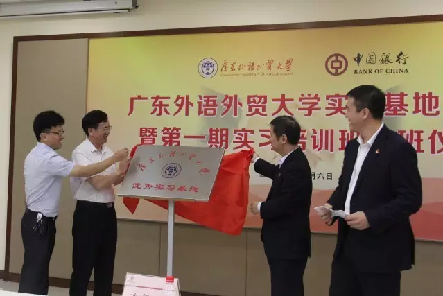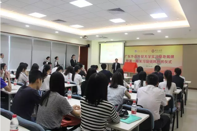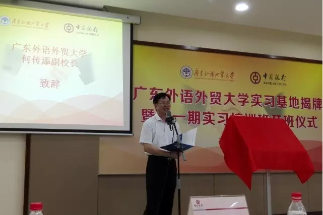 7月6日上午,广东外语外贸大学实习基地揭牌暨第一期实习培训班开班仪式在中国银行广州白云支行本部顺利举行。我校何传添副校长、金融学院院长易行健、教务处余盛明副处长及金融学院教师代表、30名实习生出席了本次揭牌仪式。中行与会代表有中行广东省分行副行长李智君、广州发展管理部行政事业业务中心主任陈炳泉、广州发展管理部行政事业业务中心高级经理任金金、白云支行长庞辉等领导及员工代表。揭牌仪式由庞辉主持。