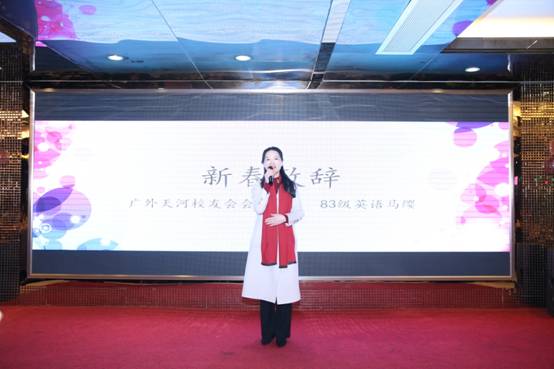 我校83级英语校友、天河校友会会长马缨在新春致辞中回顾天河校友会从成立到发展壮大的三年多时间中的点滴。借习近平主席在新年贺词中提到的“幸福都是奋斗出来的”和隋广军在去年毕业典礼上勉励大家的 “一步一个脚印走好未来路”的话语,她希望各位校友扎实走好每一步,创造属于自己的美好未来。