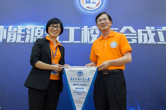 何传添为能源化工校友会授旗